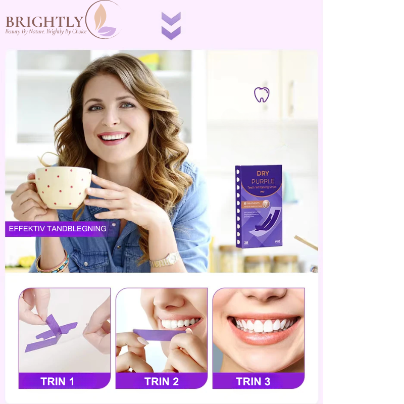 I stedet for traditionelle blegemidler anvender disse strips en unik lilla farvekorrektionsteknologi, som neutraliserer gullige toner på tænderne.